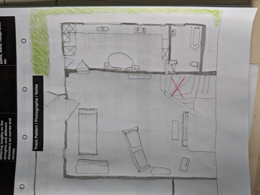 Here we go. First of all let’s get a plan of the space that you have available to begin your indoor tracking. I sketched out my plan in the puppies tracking log book, but as long as you can find some paper and a pencil you’ll be fine. You don’t need to draw your home to scale, but it will help if you can plot the windows and doors reasonably accurately. Mark a big red X over spaces that are out of bounds. For example, where there are fragile things or stairs. It doesn’t matter how complex or straight forward your space is, we will come back together soon to plot your ideal first indoor tracks. Have fun!